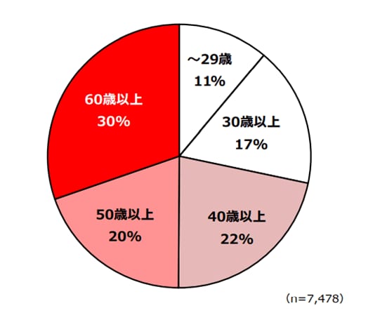 上記円グラフで40歳以上のミドル・シニア層が全体の7割以上を占めています。一方、20代と30代は全体の3割未満です。