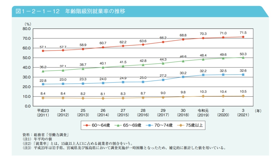 また、65から69歳の就業率は2021年には半数を超え、50.3%という結果に。