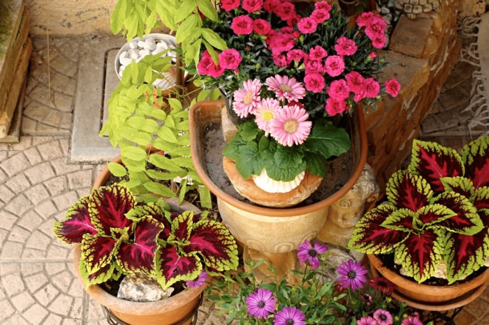 簡単にオシャレに見えるようにするには、数鉢を置いて、高さをそれぞれ変えてみること。フラワースタンドを使ったり、鉢の大きさを変えてみるのもよいでしょう。