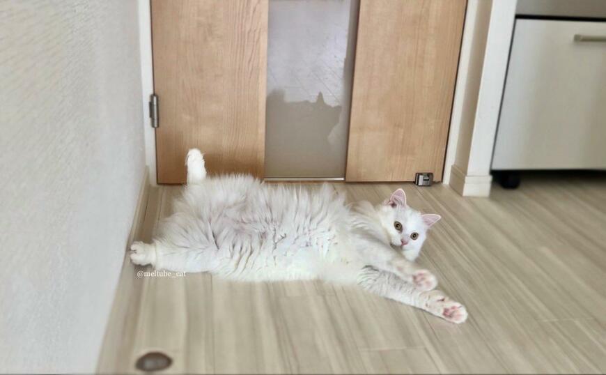 マオくんはドアの前にゴロンと転がり、一生懸命に手を伸ばすとともに、両足を大きく広げています。モフモフのお腹を惜しげもなく披露するマオくんの姿からは「仕事に行ってほしくない」という気持ちが感じられます……!
