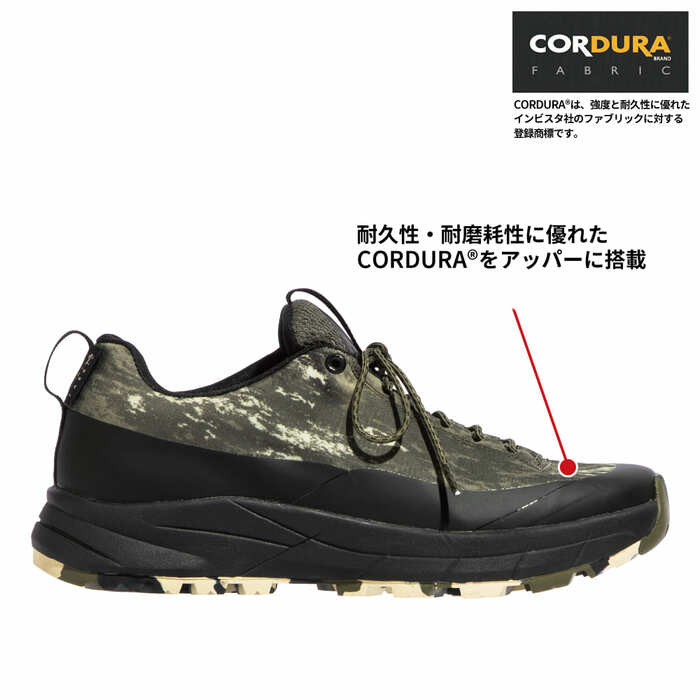 アッパーは、耐久性と耐摩耗に優れたCORDURA®を搭載。タウンユースはもちろん、山歩きやキャンプなどのアウトドアシーンでも活躍します。