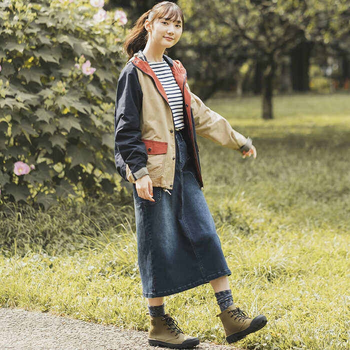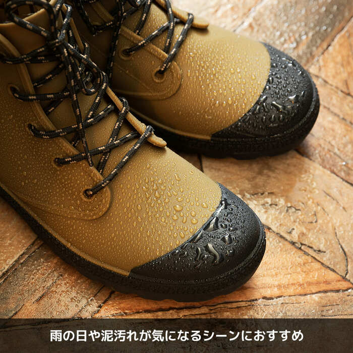 ファッション性の高い、編み上げタイプのシューズ。防水素材なので、雨の日や泥汚れが気になるシーンでも活躍します。履き口に合皮を巻き、足が痛くなりにくい仕様。ベーシックなカラーなので、どんなファッションにも合わせやすいです。