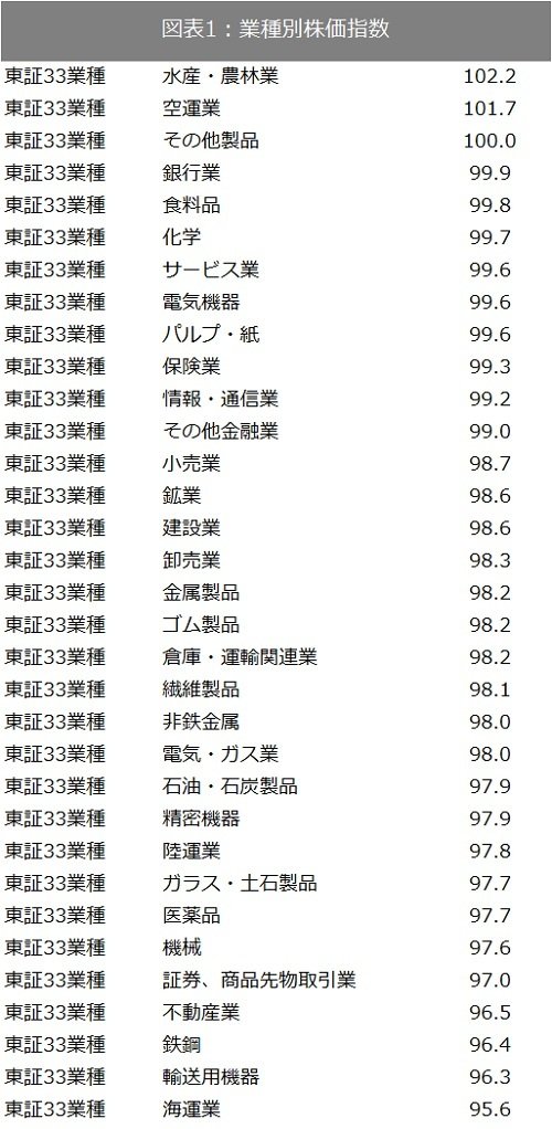 今週は、水産・農林業株、空運株の2業種が上昇。その他製品のみ変わらず。