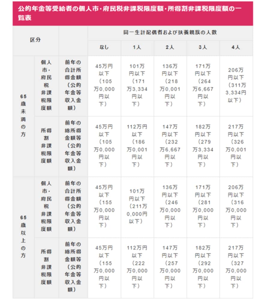 先ほど確認した東京23区の場合、前年の合計所得金額が45万円以下で、扶養家族の有無にかかわらず住民税非課税になります。