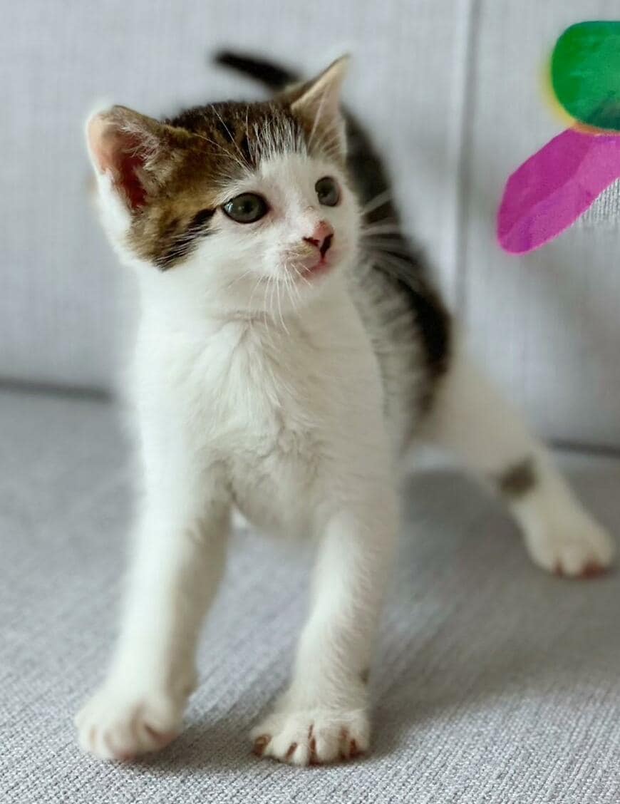 両足をしっかり着地させて、踏ん張るポーズが可愛らしいですね。子猫らしさを感じられるフワフワの毛並みも相まって、ホッコリとした雰囲気がただよっています。
