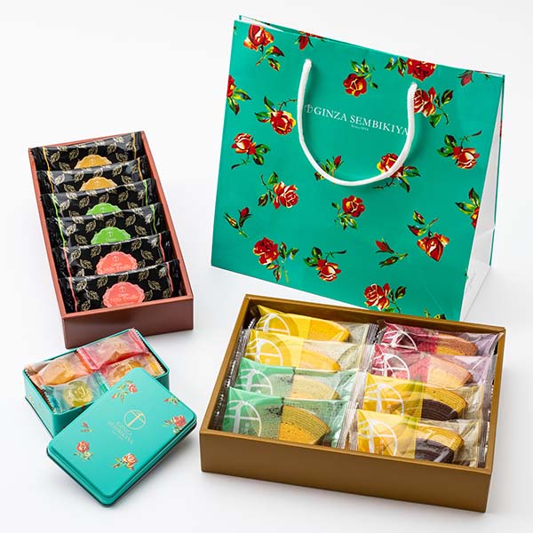 銀座千疋屋人気の洋菓子を詰合せています。「銀座フルーツクーヘン」は、一層ずつ丁寧に焼き上げた生地がしっとりとした口当たりが楽しめます。生地に混ぜた果汁の程良い甘さが口いっぱいに広がり、味はイチゴ&ミルク、レモン&はちみつ、メロン&ミルク、バナナ&チョコ 4種です。「缶入り銀座ひとくちフルーツゼリー」は、果汁のおいしさをぎゅっと閉じ込めたひとくちサイズのフルーツゼリーです。ピーチ・ストロベリー・メロン・日向夏の4種入り。「銀座ミルフィーユ」は、薄く香ばしく焼き上げたパイ生地とさっくりとしたメレンゲに、プラリネ・メロン・ストロベリーの風味豊かなクリームをサンドしチョコレートでコーティングしています。