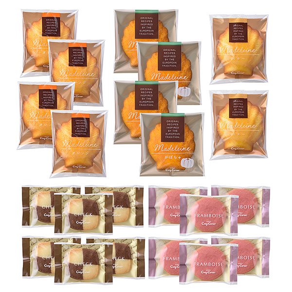 ・内容:バターマドレーヌ2個、オレンジマドレーヌ4個、かぼちゃマドレーヌ4個、クッキーチェック6個、クッキーフランボワーズ6個
