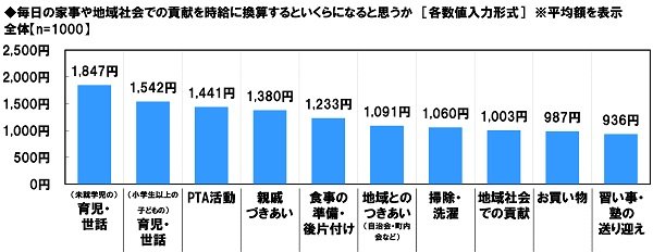 たとえば「(未就学児の)育児・世話」は時給1847円、「(小学生以上の子どもの)育児・世話」は1542円、「PTA活動」は1441円、「食事の準備・後片付け」が1233円、「掃除・洗濯」は1060円などとなっています。