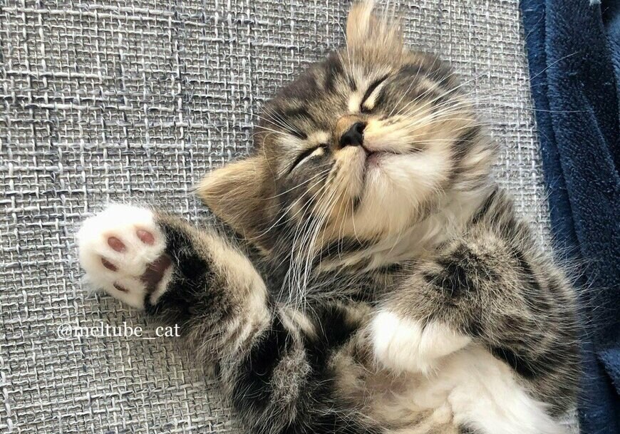 お迎えしたばかりの頃のメルくんは、笑顔にも見えるような表情を浮かべて、幸せそうに眠っていますね。お腹を大胆に披露する愛らしい姿からは、安心しきっていることが伝わってきますね……!