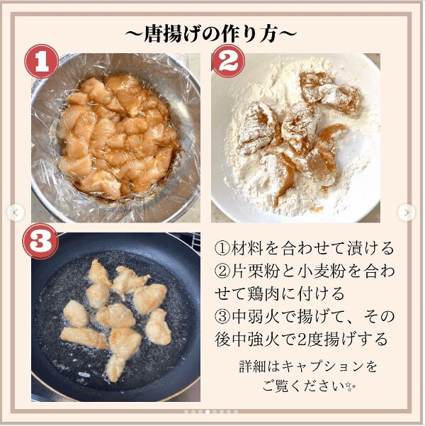 - 片栗粉と小麦粉を1:1で混ぜ、鶏肉に付ける。同時にフライパンの底が埋まるくらいまで油を入れ、中弱火で温めておく。