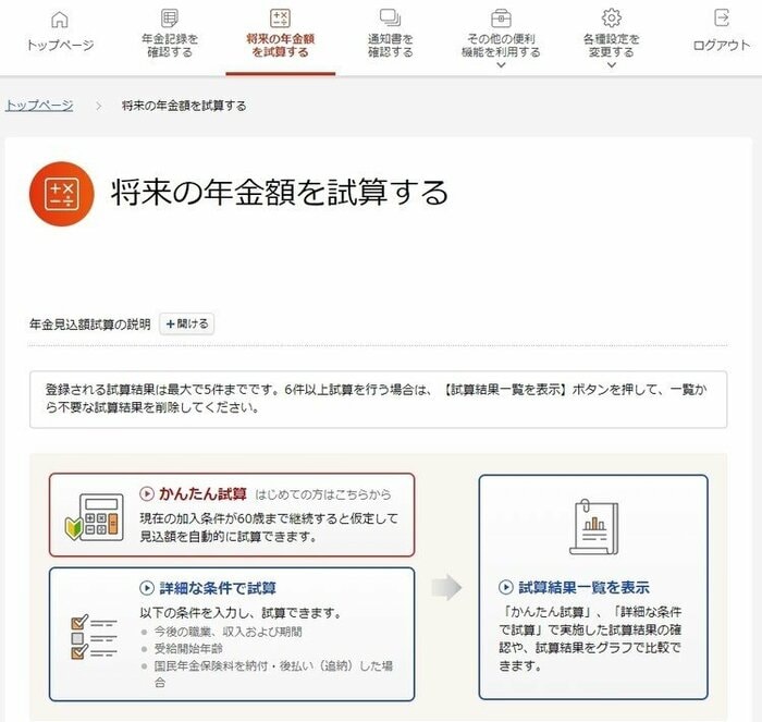 ねんきんネットの試算では、今後の職業や収入・受給開始年齢など自分にあわせた設定で年金の見込額を試算することができます。
