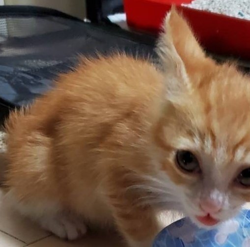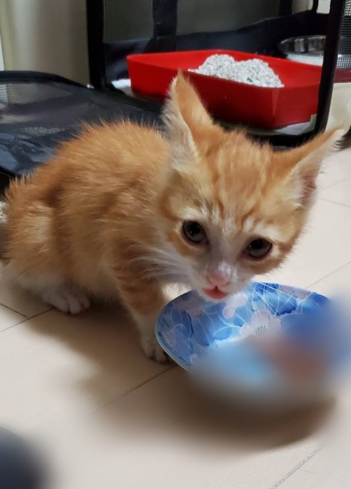 ツイートには「拾ってすぐのプリン」「ご飯をあげたら鳴きながら食べてたな…」というコメントが添えられていました。