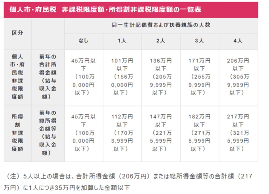 個人市・府民税非課税限度額の一覧表