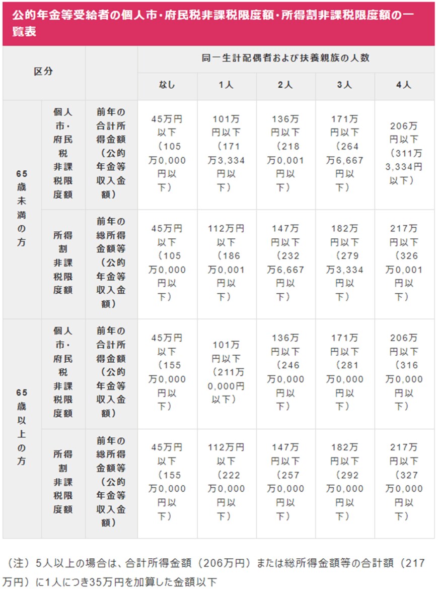 個人市・府民税非課税限度額の一覧表(公的年金等受給者)