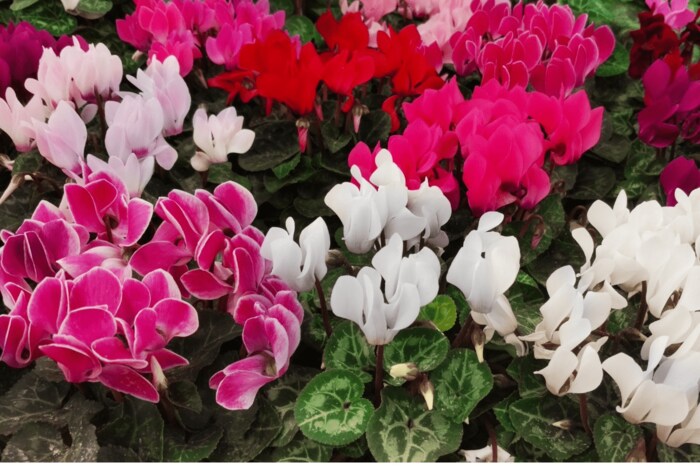 うつむき加減の可憐な花姿が人気のガーデンシクラメン。晩秋から翌春にかけて咲く多年草で、深紅や濃いピンク、紫や白など、深みのある花色で秋冬花壇をオシャレに彩ってくれます。