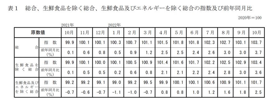 2022年1月からの総合指数(生鮮食品を除く)をみると、どの月も前年同月比を上回っており、4~10月は2~3%となっています。