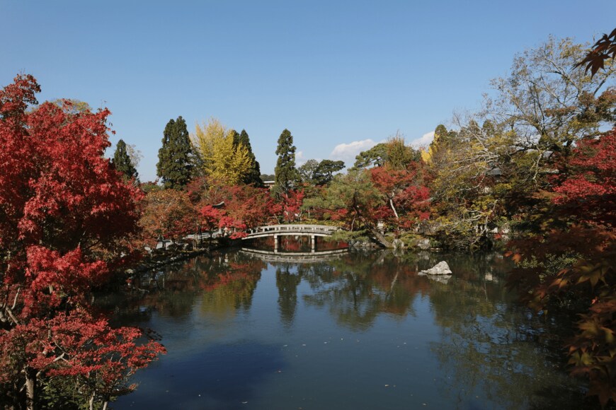 古来から紅葉の名所として親しまれている永観堂には、およそ3000本ものモミジが池泉回遊式庭園を鮮やかにし、多宝塔や御影堂を秋色に包み込んでいます。