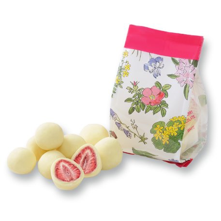 「ストロベリーチョコホワイト」はフリーズドライの苺をホワイトチョコレートで丸くコーティングしたスイーツです。苺の酸味とホワイトチョコレートの甘みがマッチしてクセになる味わいとなっています。サクッとした食感も人気のようです。