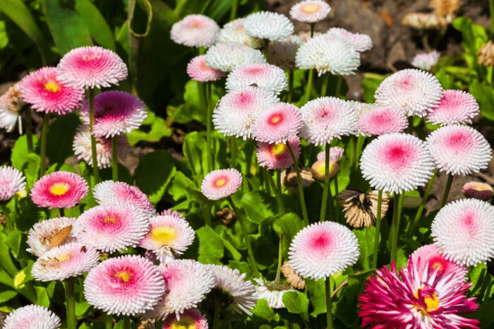 丸い花が愛らしいデージーはキク科の一年草。特別な世話は不要なので、初心者にも育てやすい草花です。横長のプランターなどに植えると、可愛らしい見映えになりますよ。