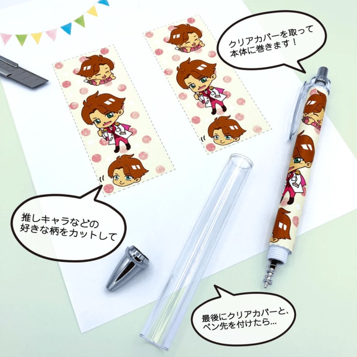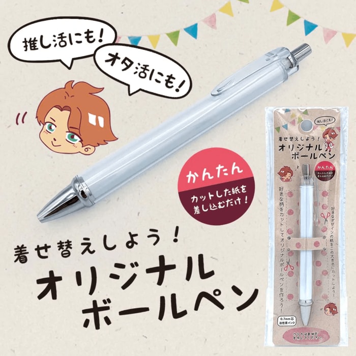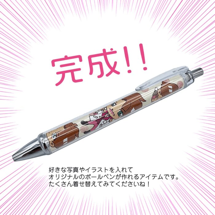 推しの写真やイラストを入れて、オリジナルのボールペンを作れる「着せ替え用オリジナルボールペン」。本体がクリアカバーとなっており、気分に合わせてデザインを変えられます。勉強したりメモを取ったり、普段の生活がさらに楽しくなること間違いなしのアイテムです。