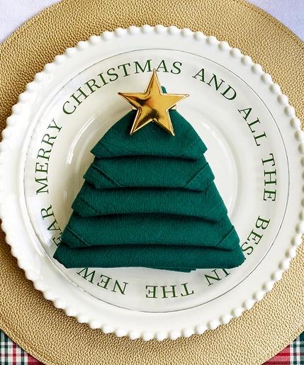 写真のように、クリスマスツリーの形に折りたたんで食卓に置けば一気にクリスマスらしい雰囲気に仕上がります。