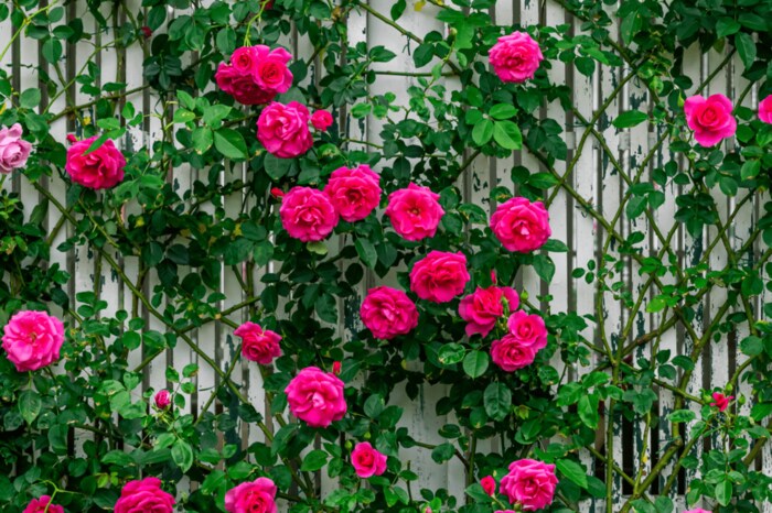 フェンスや壁面、トレリスやアーチなどを利用し、ツル性植物を縦方向に這すのもオススメです。