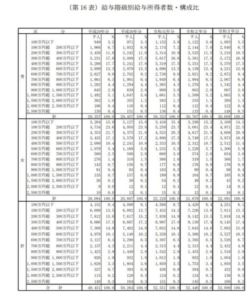 では、実際に「100万円未満~2500万円超」の金額ごとにどれだけ給与所得者数がいるのか、男女別に確認しましょう。