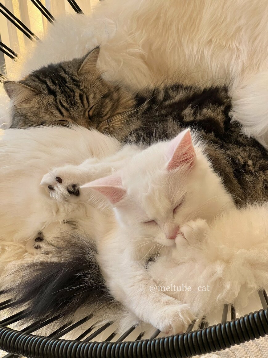 メルくんは脚でマオくんの体を挟むようにしながら、熟睡しているようですね。温もりを感じて安心しているのか、マオくんも非常に幸せそうな表情で毛づくろいをしています。