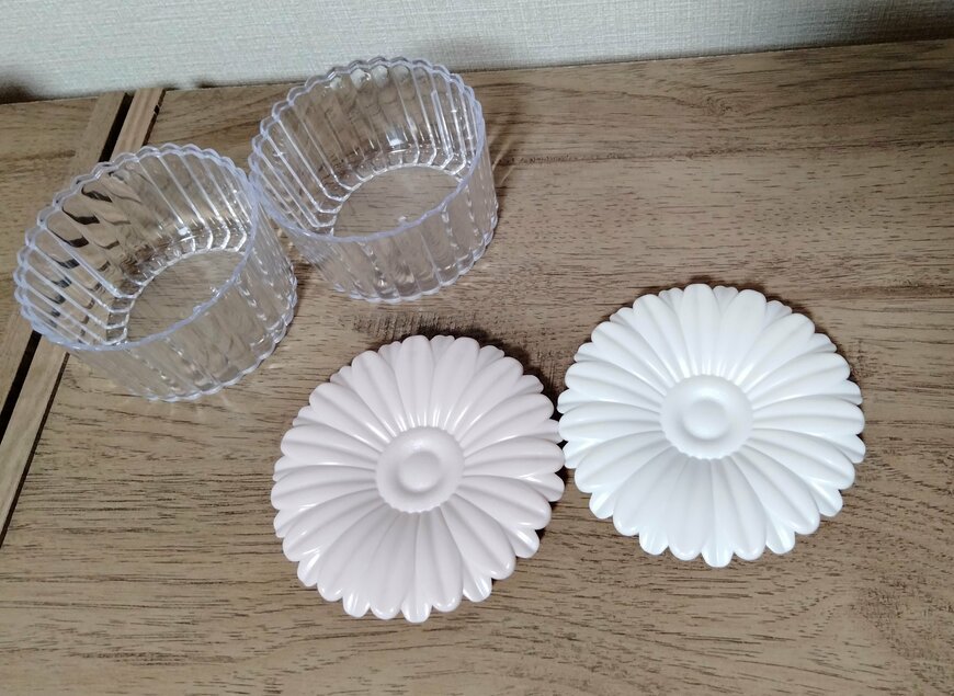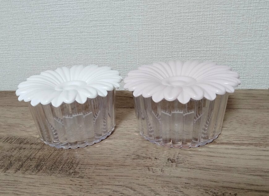 こちらがセリアの「ガーベラ」がかわいい「インテリアポット」です。フタが写真のように、花の形になっています。ガーベラの花びらが一枚一枚きれいに浮かび上がっています。
