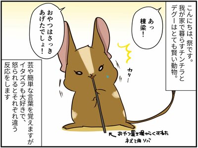 祭さんのおうちで暮らすチンチラやデグーは、みなとても頭がいい子たちです。簡単な言葉は覚える一方で、いたずらも大好き。そのたびに祭さんが怒るのですが、それぞれリアクションが違うようで…。