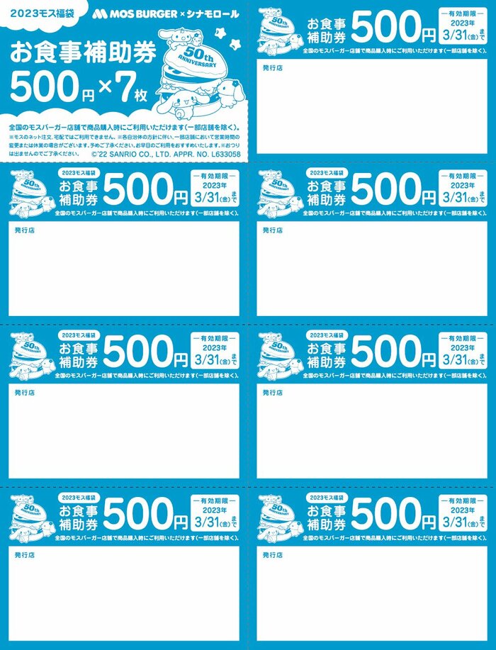 モスバーガーは、2022年12月30日(金)から全国のモスバーガー店舗(一部店舗除く)にて、サンリオの人気キャラクター『シナモロール』とコラボレーションしたグッズと、福袋の販売額相当の“お食事補助券”が入った「2023モス福袋」(税込3500円)を数量限定で販売します。それに伴い、2022年12月1日(木)~12月26日(月)の間、ネットで事前予約の受付をおこないます。
