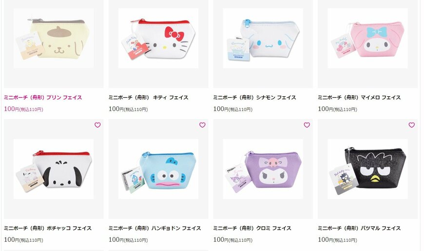 サンリオの舟形ポーチはかわいいサンリオキャラが両面にデザインされています。110円(税込)ながら豪華な仕様です。バリエーションは以下の通りです。