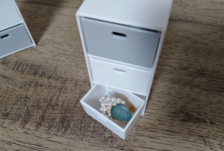 引き出し部分に、イヤリングやピアスを入れて、アクセサリーケースにしてもかわいいです。