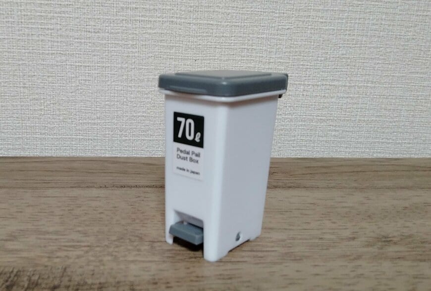 こちらがセリアで販売されているミニチュアのゴミ箱です。ペダルを踏めばフタが開くタイプのゴミ箱です。