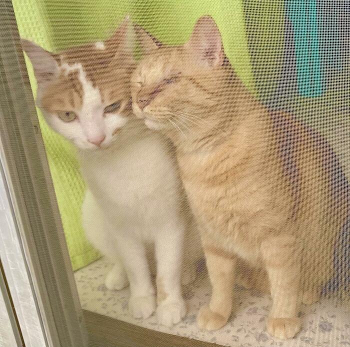 写真に写っているのは、2匹の猫ちゃんです。右に写る「モカ」くんと、左に写る「エル」くんは、ニャルソックの最中だった様子。