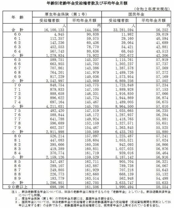 では、いまのシニアが受け取る年金額について、年齢ごとの平均額を1歳刻みでみていきましょう。ここからは、「令和2年度 厚生年金保険・国民年金事業の概況」を参考します。