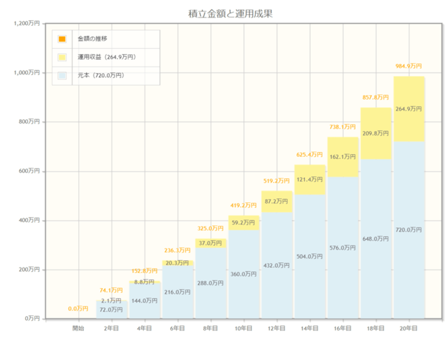 まずは「毎月3万円・20年間・年利3%」で運用した場合の金融庁によるシミュレーション結果です。