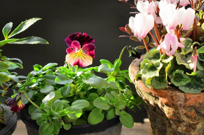 しっとりとした美しさが印象的なガーデンシクラメンは、パンジー・ビオラと開花時期が同じ冬の花。ともに寄せ植えによく用いられる王道の組み合わせです。