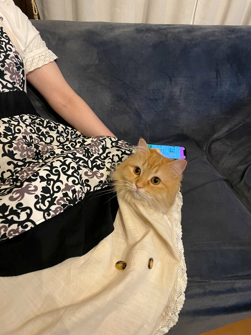 スカートから顔だけをヒョッコリと出し、凛々しい表情で一点を見つめる姿はなんだかシュール。何気なく話し合いをしている最中に、猫ちゃんが突如ノリノリで生えてきたら……思わず爆笑してしまいそうです。