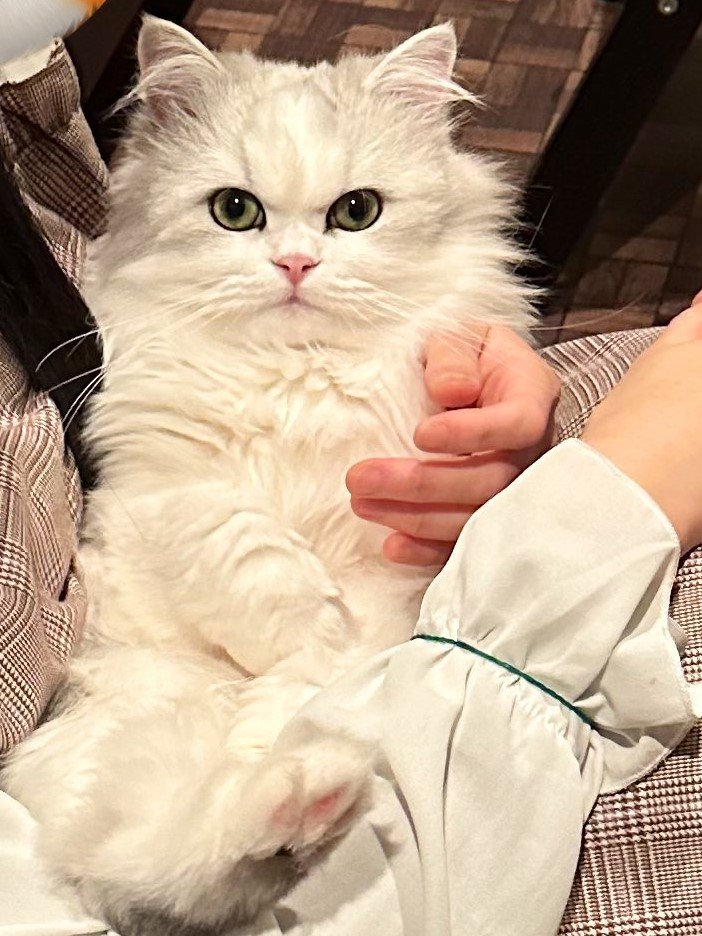 そこに写っていたのは、ママさんに抱っこされる1匹の猫ちゃんです。白猫の男の子「ノーマン」くんは、白色のモフモフな毛並みとキリリとした面持ちがとっても印象的。まさにイケメン男の子といった印象です……!