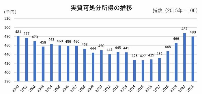 そこから増えていきますが、2021年の実質可処分所得は2000年とほぼ同じとなっています。