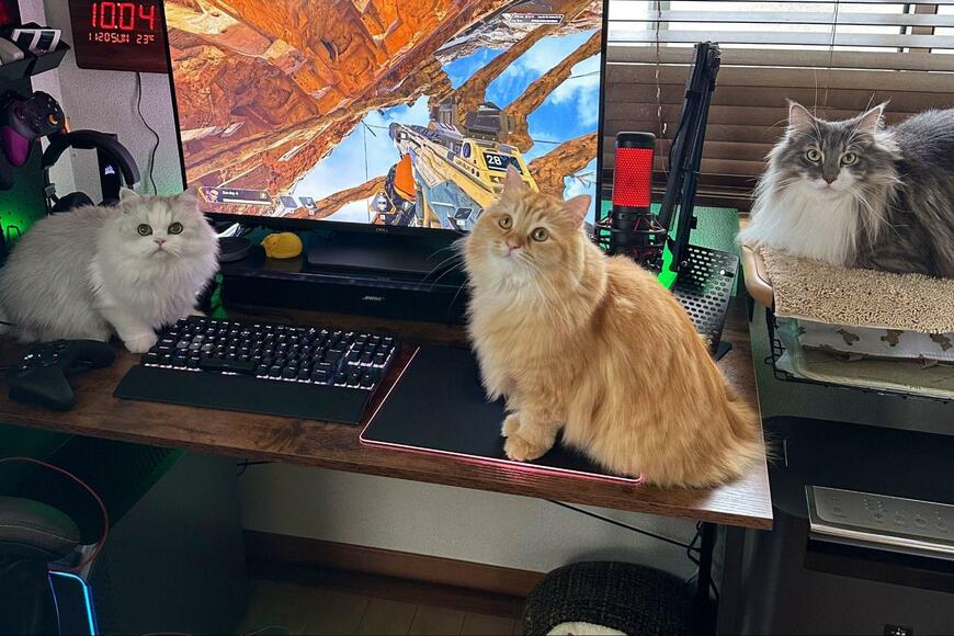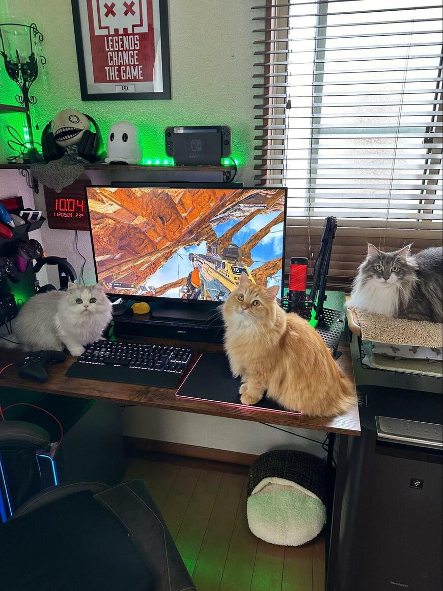 そんな書き込みとともに投稿されたのは、1枚の写真でした。写真に写っているのは、パソコンなどが置かれたデスクの周辺に勢ぞろいする猫ちゃんたちです。