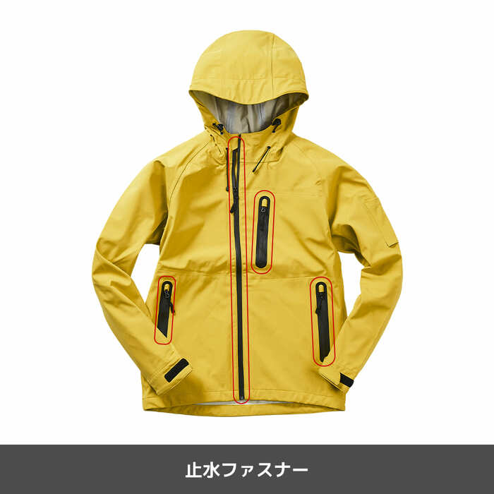 耐水圧 10000mmという十分な耐水圧で雨の日も浸水しにくく快適な着心地です。また、2000g/m2/24hという透湿性もあり、蒸れにくいのもうれしいですね。
