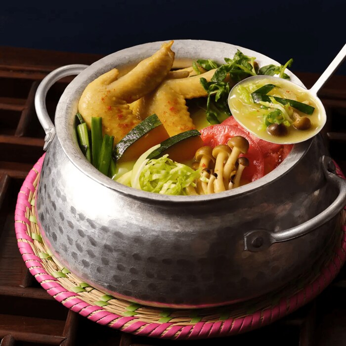 ニンニクやクミン、ウコンなどの複数のスパイスを、濃厚な白湯スープにたっぷりと加えて作られているのが「スパイス鍋の素」です。パンチがありながらバランスが良く、スタミナアップが狙えそうな味わいが特徴。白湯スープの味わいを引き立てる手羽先と一緒に、かぼちゃやキャベツ、トマトなど、たっぷりの野菜を入れて楽しめます。