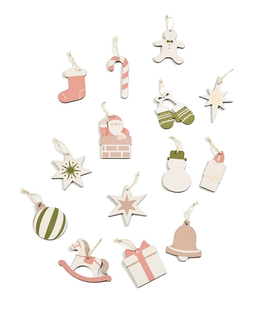 オーナメント飾りは写真のように14種あります。ホワイトもグリーンも、オーナメントは同じものが付属しています。