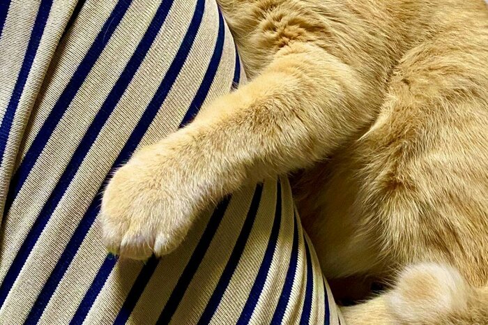 飼い主さんのお膝に手をしっかりと密着させ、独り占めしたいといわんばかりの格好で甘えていますね。見ているこちらまで幸せになってしまうような、癒しの光景です……!