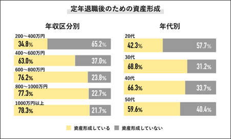 はじめの株式会社ライボの調査によれば、定年退職後のための資産形成をしてる年代は30歳代が最も多い一方で、定年目前の50歳代でも約4割がしていません。