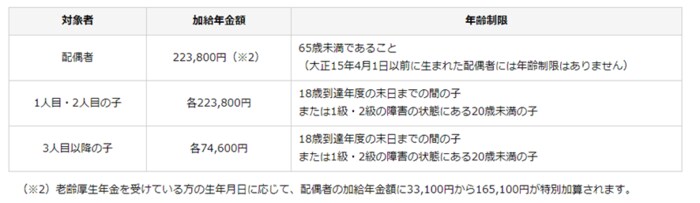 65歳未満の配偶者がいる場合、22万3800円の加給年金が受け取れるということです。