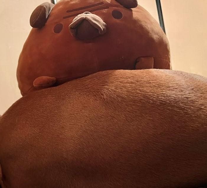 ぬいぐるみとワンちゃんの色がとっても似ているからか「1つのぬいぐるみ」が写った光景に見えてしまいました。