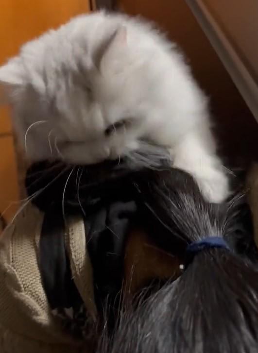 奥様の背中をさらによじ登るノーマンくん。毛繕いの勢いは留まりません……!